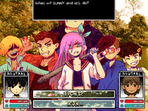 KEL and SUNNY can first encounter AUBREY and the rest of THE HOOLIGANS riding their scooters down the lower street in FARAWAY. Later, when they see BASIL asking KIM to talk to AUBREY for him, KEL gets involved as he sticks up for him. This causes a commotion that alerts the attention of AUBREY, who shows up with the other HOOLIGANS. SUNNY and KEL fight AUBREY, but the group flees after noticing SUNNY is armed with a knife, potentially after SUNNY stabbed her with it depending on the actions the role player took during the preceding fight.